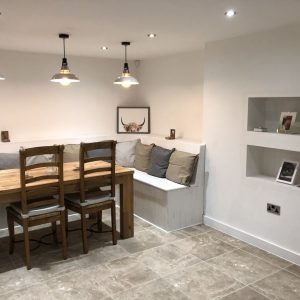 Our clients acquired their bungalow in Brighouse with a view to carry out extensive alterations. The basement area was not full head height throughout and required some excavation. Pure Basement Systems designed and installed a full basement waterproofing system as part of the project. The newly formed basement space provided a large family Kitchen with Dining Area, A TV room and a separate utility room.